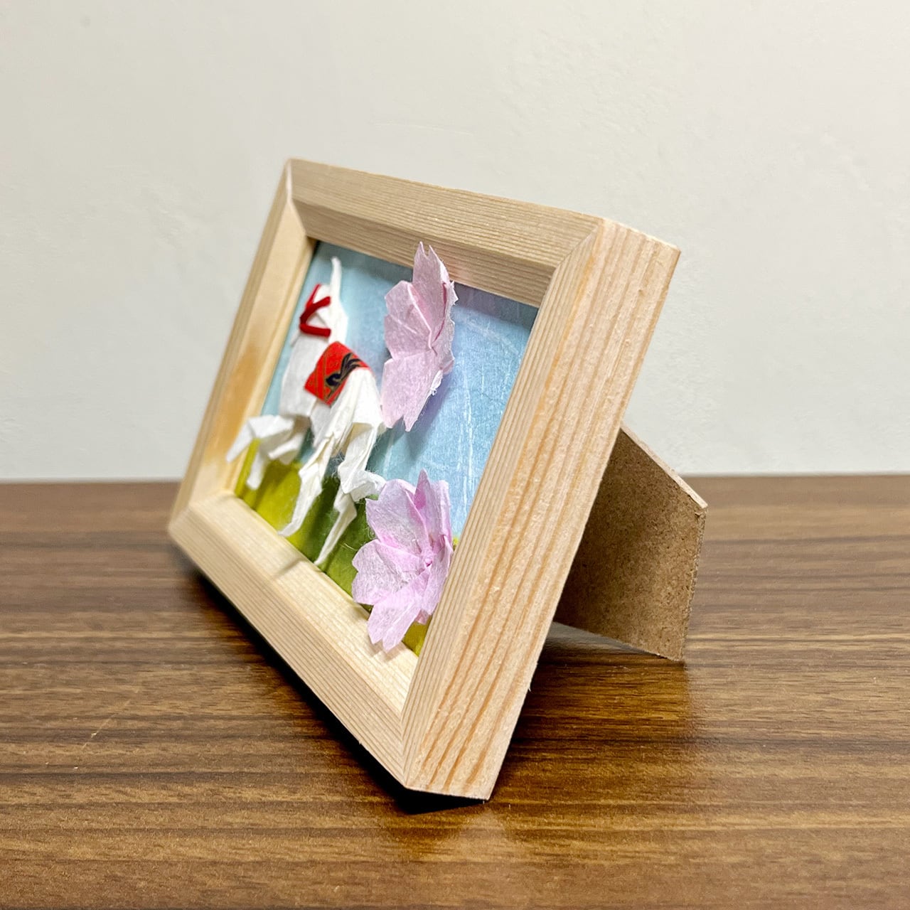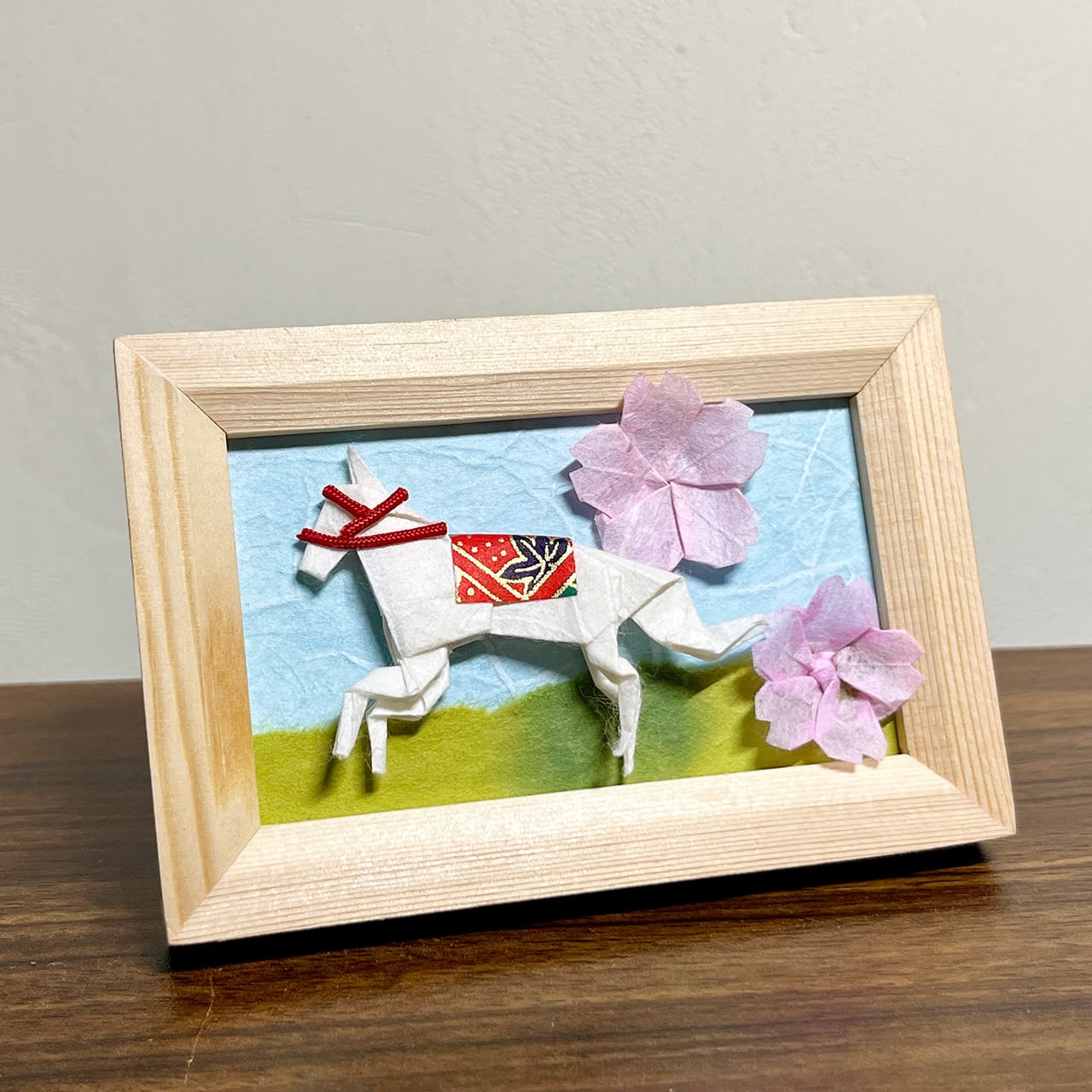 白馬と桜をおりがみで表現した、手のひらサイズのフォトフレームです。