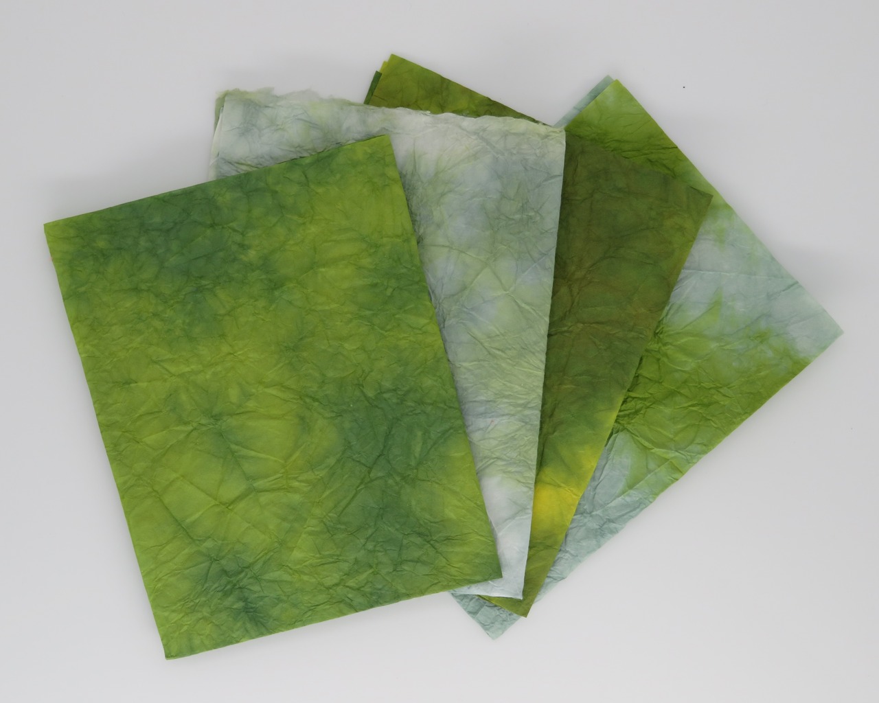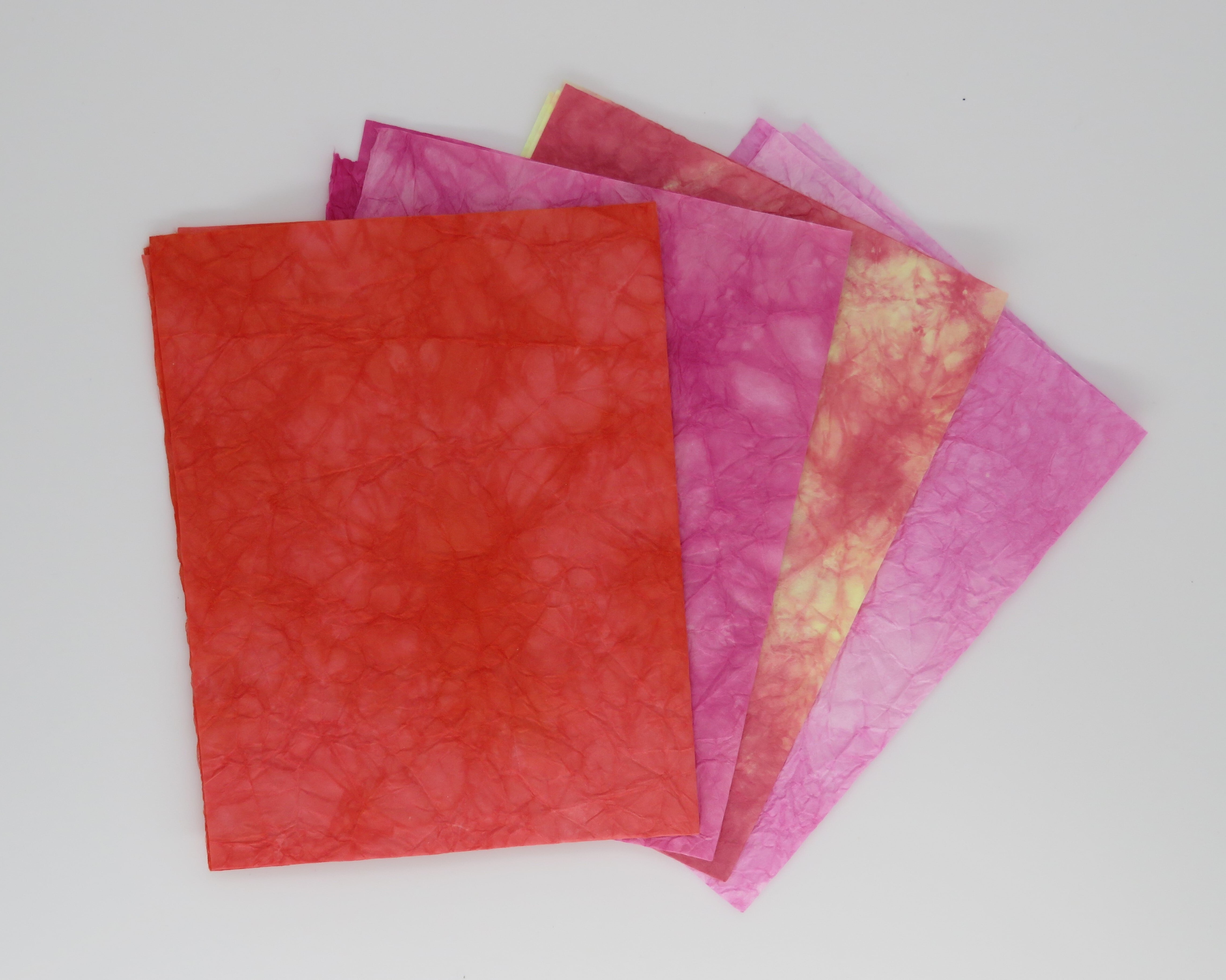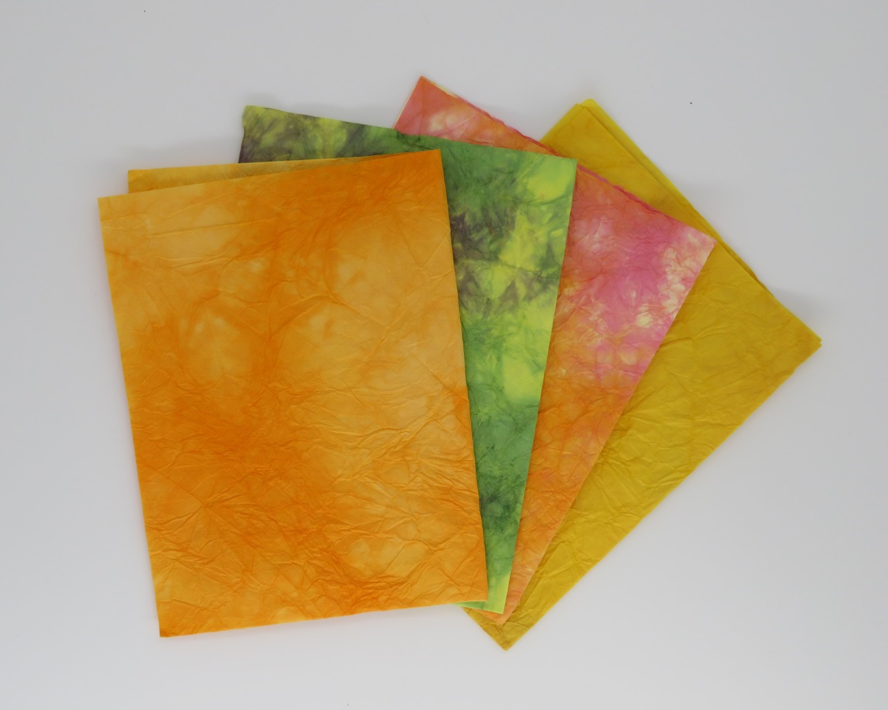 「もみ染紙」は、和紙を一枚一枚、手でもみ、2〜3色の染料に浸け染めした和紙です。